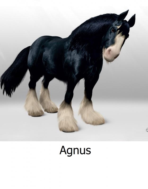 Конь принцессы Мериды, верный друг и спутник во всех её путешествиях. Вороной и белоногий, огромный, безумно красивый конь клейдесдальской породы. Он наделен чисто лошадиным характером, поэтому бывает ретив и азартен, но в общем и целом предан своей хозяйке.